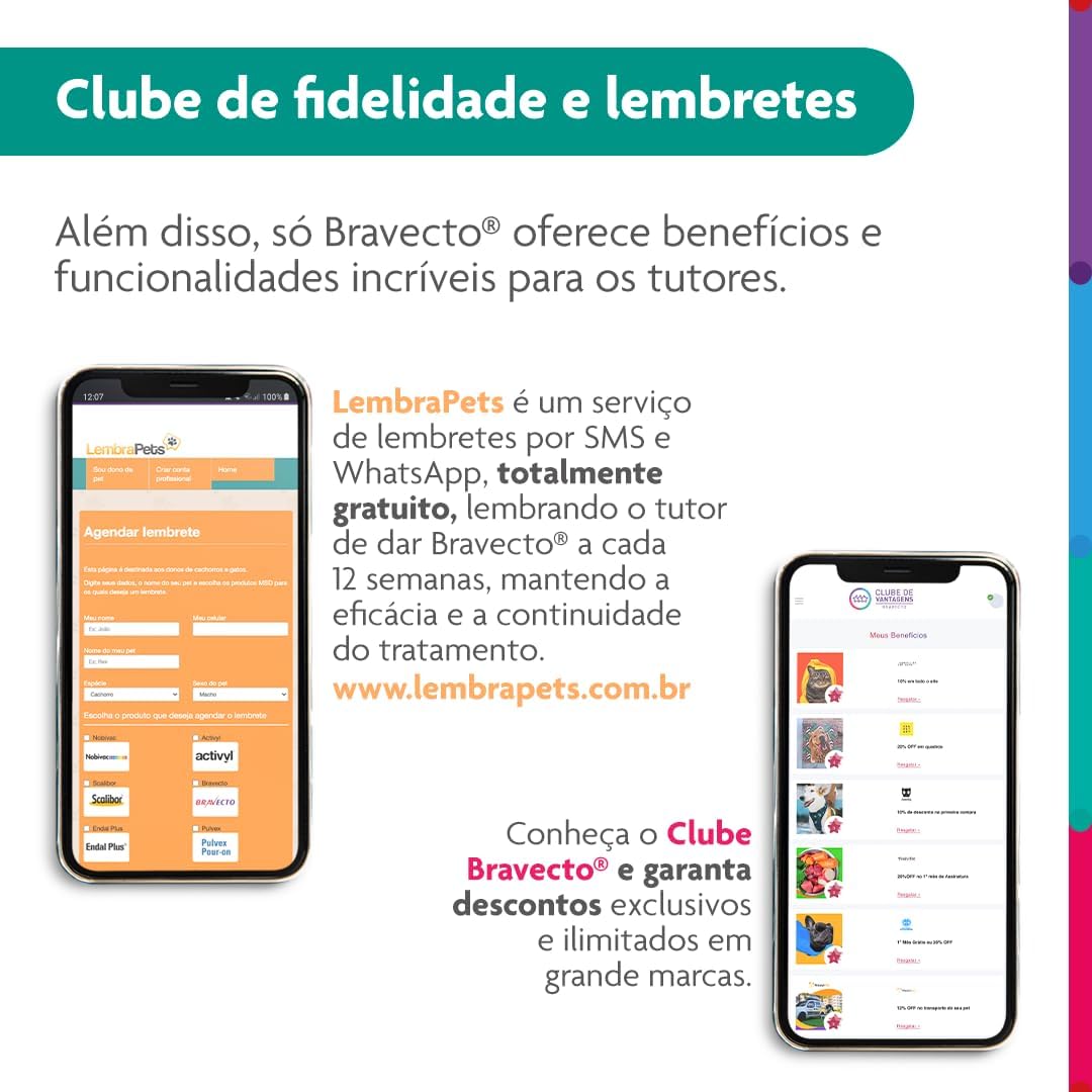 Desenvolvido com o princípio ativo fluralaner, um potente inseticida e acaricida, o bravecto para gatos protege três vezes mais do que a maioria dos preventivos contra pulgas. Além disso, cada dose é super potente, tornando mais fácil manter seu gato protegido durante todo o ano. Com o tratamento mais avançado do mercado, o bravecto interrompe o ciclo de vida da pulga de 3 meses, do ovo à idade adulta, bloqueando infestações e deixando o seu felino protegido.