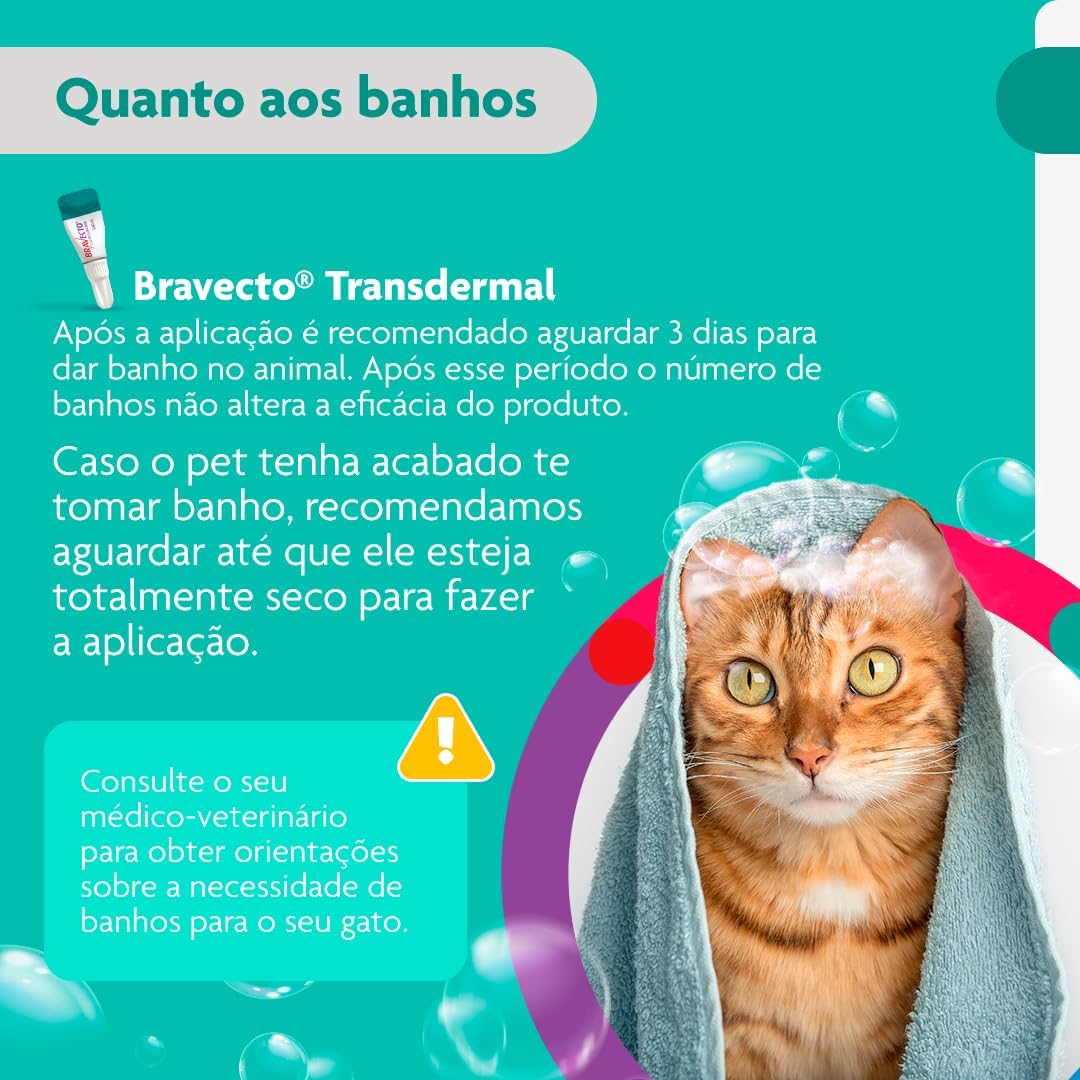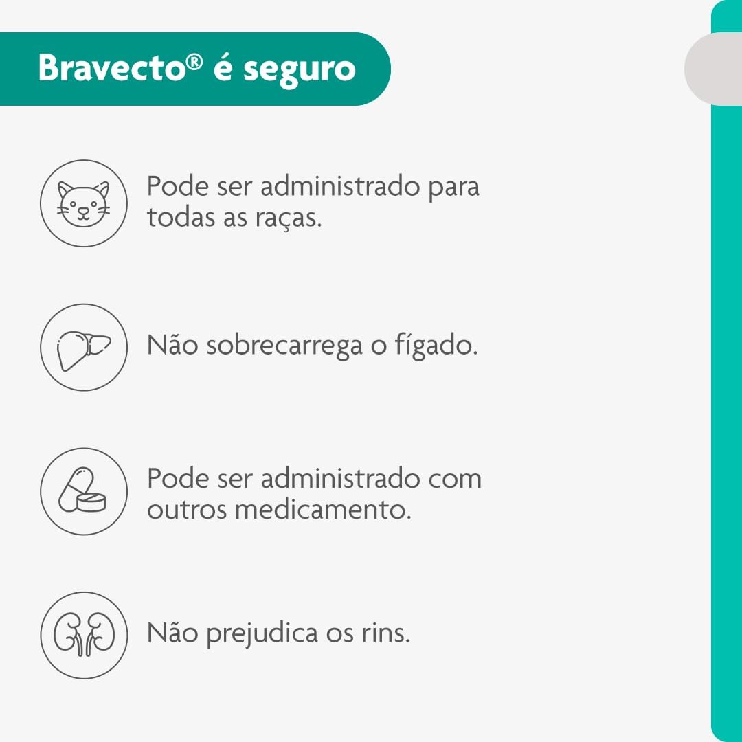 Desenvolvido com o princípio ativo fluralaner, um potente inseticida e acaricida, o bravecto para gatos protege três vezes mais do que a maioria dos preventivos contra pulgas. Além disso, cada dose é super potente, tornando mais fácil manter seu gato protegido durante todo o ano. Com o tratamento mais avançado do mercado, o bravecto interrompe o ciclo de vida da pulga de 3 meses, do ovo à idade adulta, bloqueando infestações e deixando o seu felino protegido.