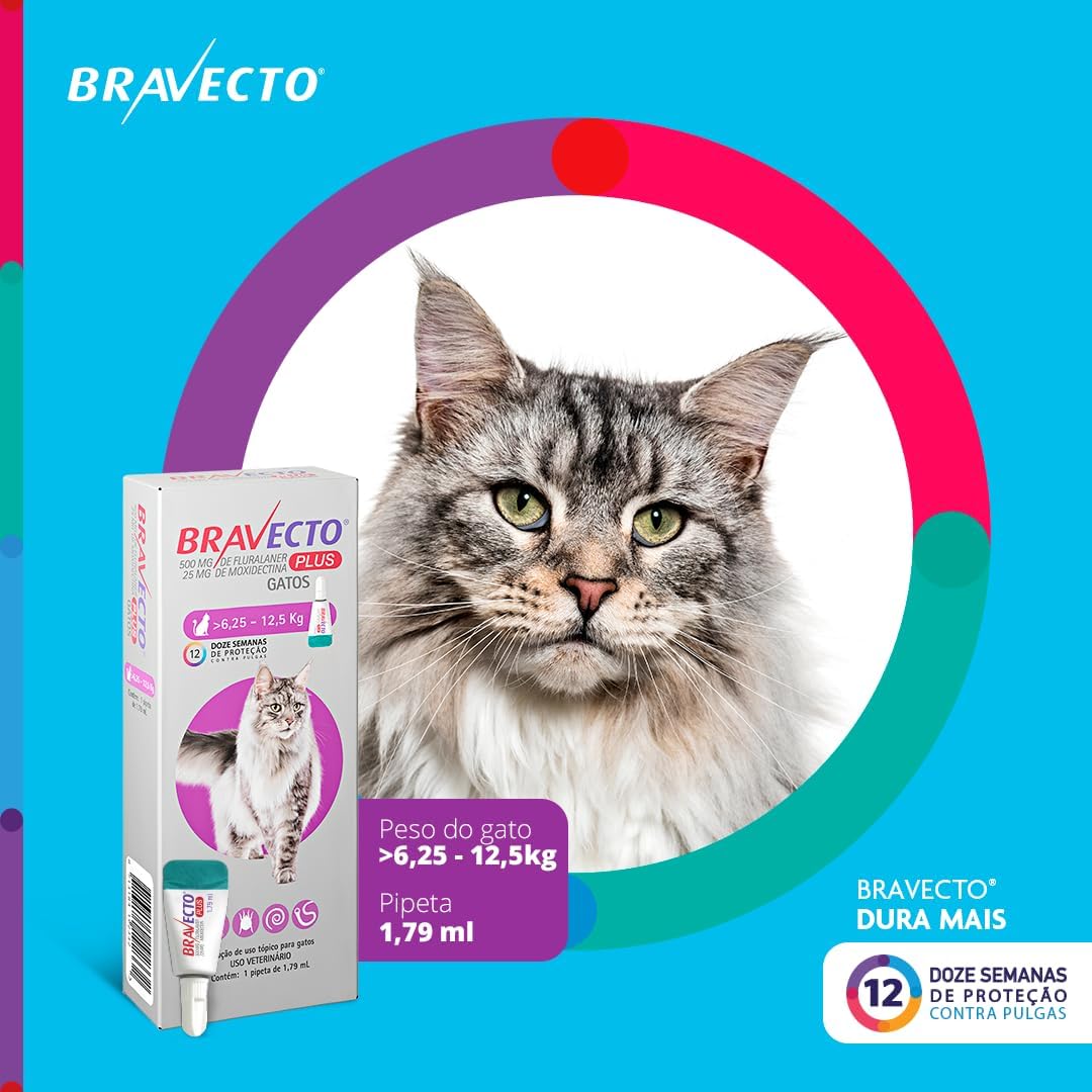 Bravecto® Plus Gatos Transdermal 500mg – Antipulgas, Sarna de ouvido, Vermes intestinais – Gatos de 6,25 a 12,5kg – 1 Pipeta 1,79ml – MSD Saúde Animal